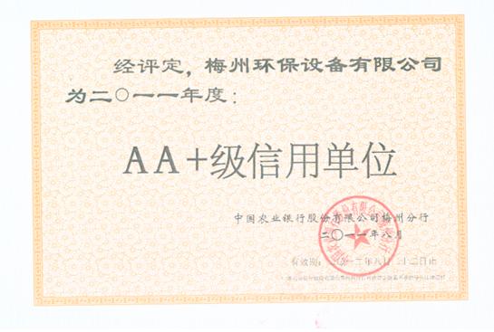 近日,我公司獲得中國農業銀行股份有限公司梅州分行頒發的“AA+級信用單位”證書。信用,是一個企業的根基,沒有信用的企業終將會被客戶和市場淘汰。梅州環保設備有限公司自成立以來,十分注重信用,把信用視為企業生存發展的生命要素。我們以真誠的態度,良好的信譽開展業務,與各單位合作愉快,得到了業界的認可和各級的好評。此次“AA+級信用單位”證書的頒發。